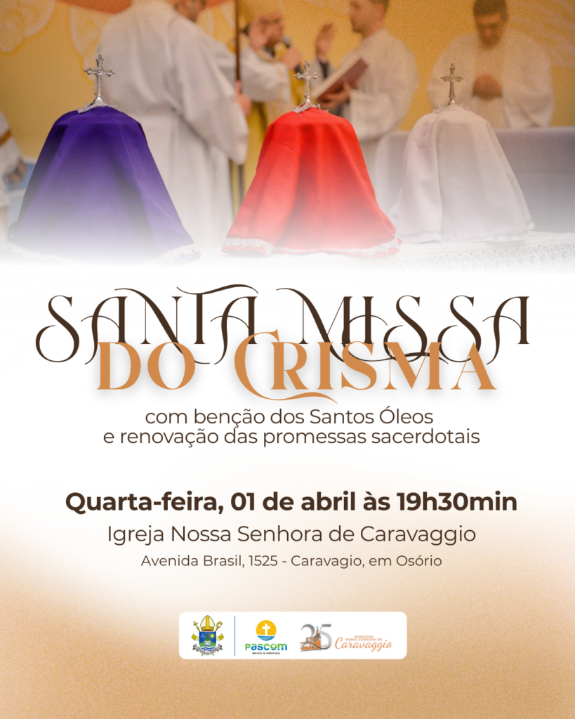 O bispo da Diocese de Osório, dom Jaime Pedro Kohl, convida os fiéis de todas as paróquias a participarem da Missa do Crisma, que será celebrada no dia 1º de abril, quarta-feira, às 19h30min, na igreja Nossa Senhora de Caravaggio, localizada na Av. Brasil, 1525, bairro Caravagio, em Osório. Presidida pelo bispo diocesano, a celebração integra a preparação imediata para o Tríduo Pascal e reúne o clero e o povo de Deus em um dos momentos mais significativos do calendário litúrgico, marcado pela bênção dos Santos Óleos e pela renovação das promessas sacerdotais.