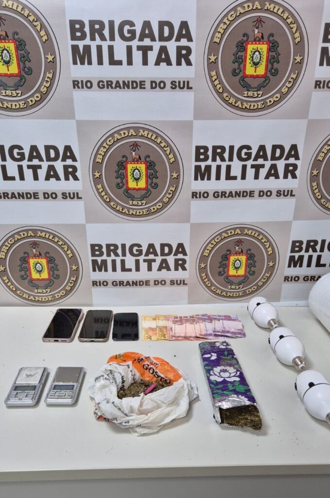 No local, foram apreendidos um tijolo de maconha pesando 652 gramas e uma porção adicional de maconha pesando 55,70 gramas, totalizando 707,70 gramas da substância, três aparelhos celulares, três câmeras de monitoramento, duas balanças de precisão, um rolo de plástico filme utilizado para fracionamento de drogas e R$ 105.