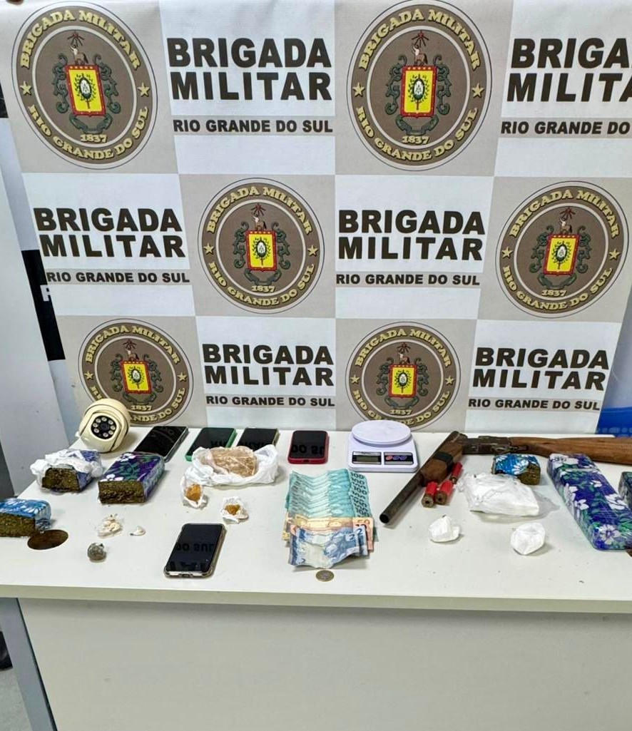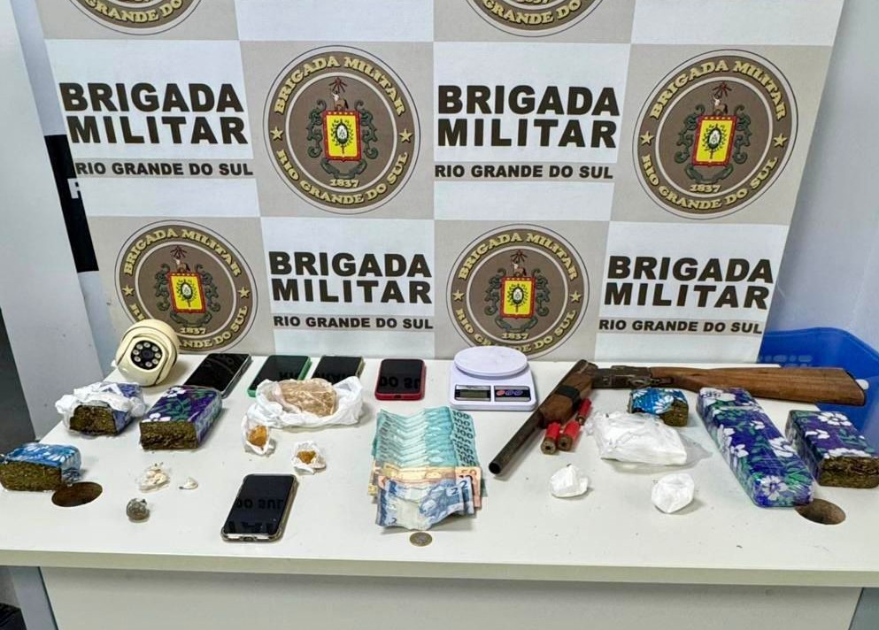 Nesta segunda ocorrência, foram apreendidos dois quilos de maconha, 250 gramas de crack e 300 gramas de cocaína, R$ 1.065,00 em espécie, uma espingarda calibre 28, munições deflagradas de calibres 28 e 12, uma balança de precisão, uma câmera de vigilância e cinco aparelhos celulares.