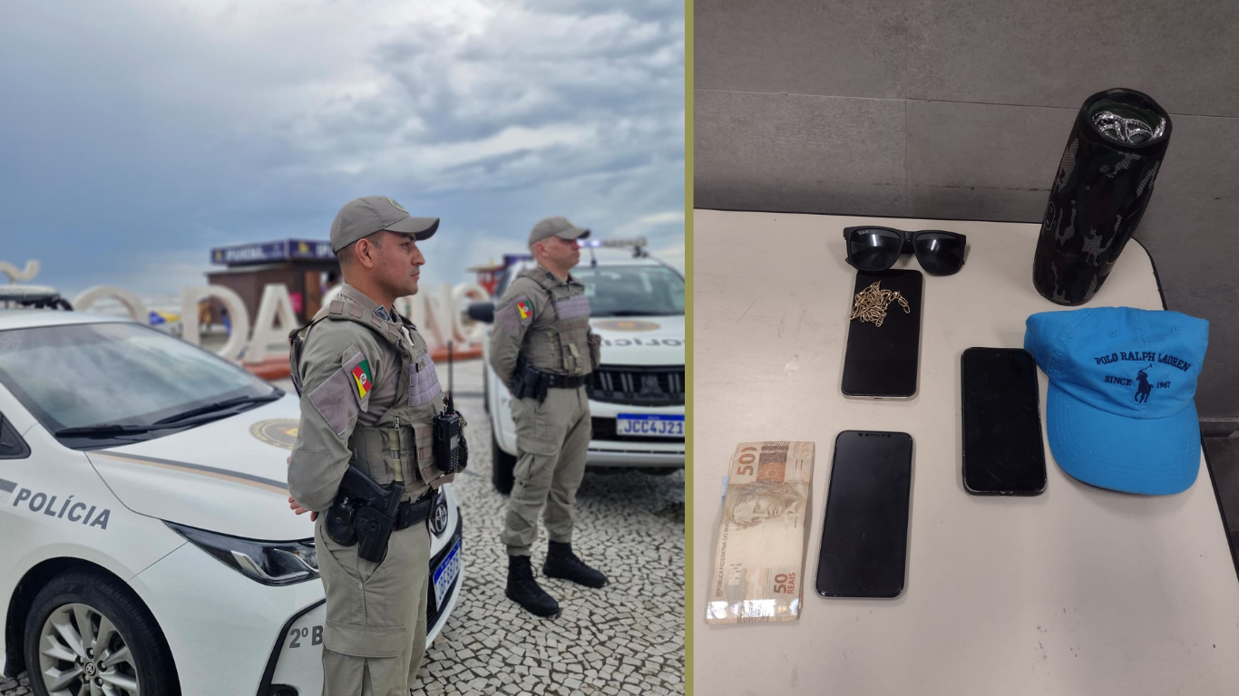 Guarnições da Brigada Militar foram mobilizadas após a informação de um roubo envolvendo três indivíduos, no centro de Capão da Canoa, na madrugada de sexta-feira (23/01). As vítimas, quatro adolescentes com idades entre 15 e 17 anos, procuraram a Base Móvel da Beira-Mar e relataram as características dos autores, informando que dois deles vestiam roupas vermelhas e um usava roupas pretas. De posse dessas informações, as guarnições iniciaram buscas e, após patrulhamento nas imediações, abordaram três homens com as características repassadas.