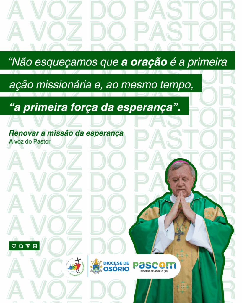 Renovemos, portanto, a missão da esperança a partir da oração, especialmente aquela alimentada pela Palavra de Deus e, em particular, pelos Salmos, que são uma grande sinfonia de oração cujo compositor é o Espírito Santo. Os Salmos ensinam a esperar na adversidade, a reconhecer os sinais de esperança e a cultivar o desejo missionário de que Deus seja louvado por todos os povos. Ao rezar, mantemos viva a chama da esperança acesa por Deus em nós, para transformá-la em um grande fogo que ilumina e aquece todos ao nosso redor — por meio de gestos concretos e atitudes inspiradas por essa mesma oração.