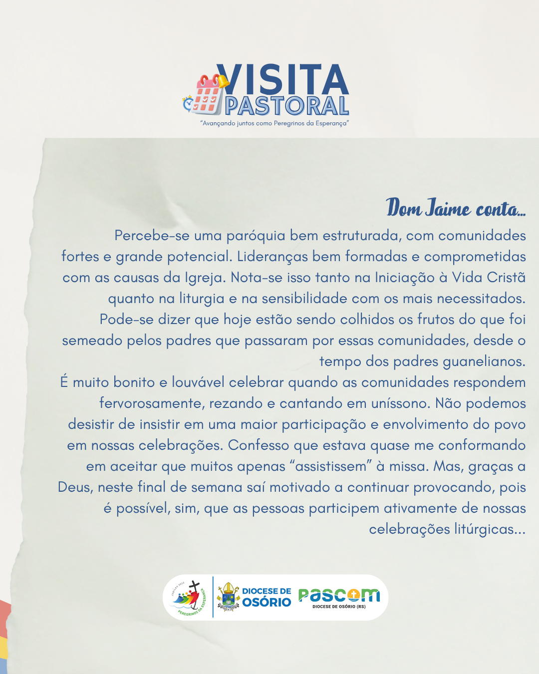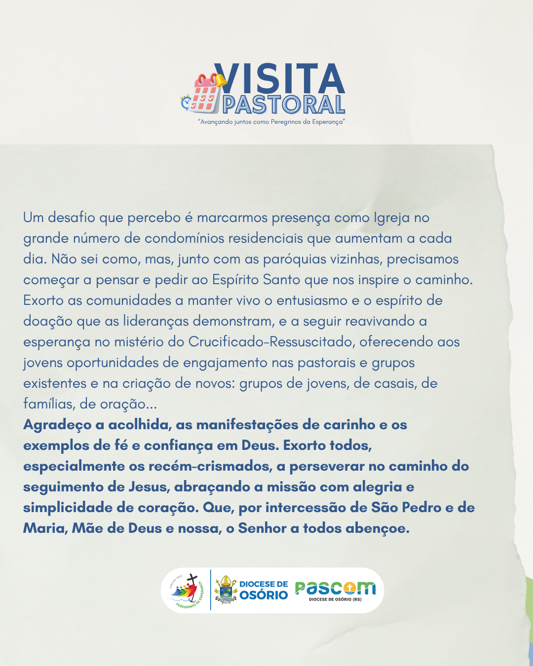 Agradeço a acolhida, as manifestações de carinho e os exemplos de fé e confiança em Deus. Exorto todos, especialmente os recém-crismados, a perseverar no caminho do seguimento de Jesus, abraçando a missão com alegria e simplicidade de coração. Que, por intercessão de São Pedro e de Maria, Mãe de Deus e nossa, o Senhor a todos abençoe.