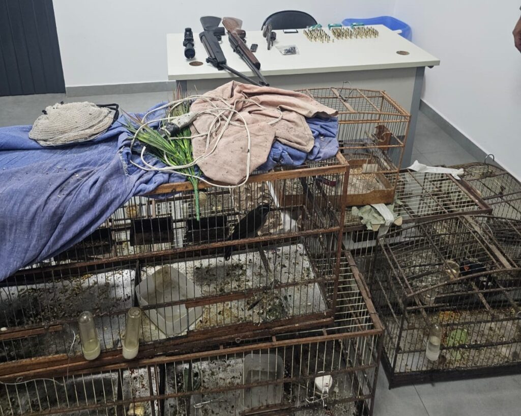 Policiais militares do 8º Batalhão de Polícia Militar (BPM) receberam denúncias sobre um homem que utilizaria espingardas de pressão para abater pássaros. No local os policiais visualizaram aves em uma área coberta nos fundos do imóvel.