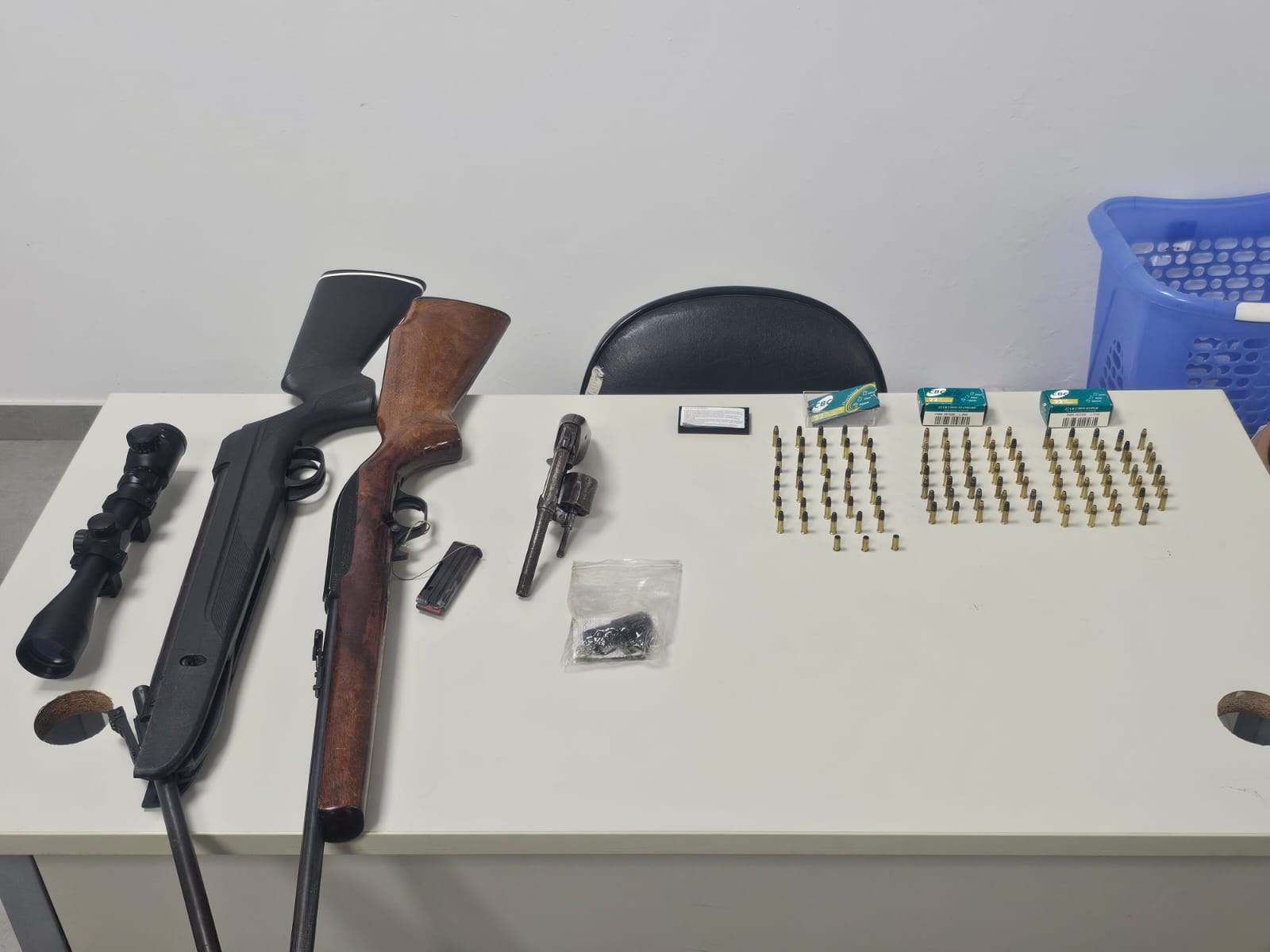 Também foram encontradas uma carabina de pressão calibre 5.5, marca CBC, um rifle calibre .22, marca CBC, acompanhado de um carregador calibre .22 vazio, um revólver calibre .22, marca Taurus, municiado com seis munições intactas, uma sacola contendo 104 munições calibre .22 intactas e três cápsulas calibre .22 deflagradas, além de uma luneta e um dispositivo de mira a laser.