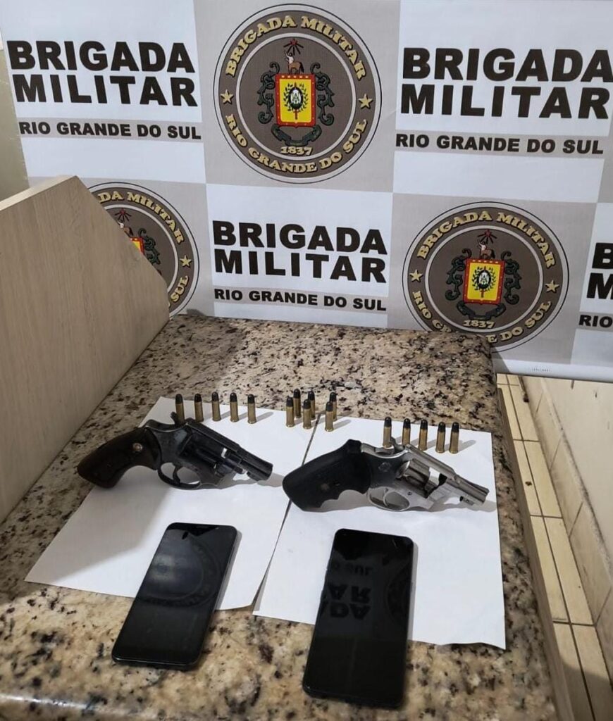 A Brigada Militar realizou a prisão de dois indivíduos, de 19 e 23 anos respectivamente. A ação ocorreu na tarde desta segunda-feira (11), em Caraá. Durante patrulhamento realizado na região, uma guarnição do 8° Batalhão de Polícia Militar recebeu informações sobre dois homens que estariam portando duas armas de fogo.