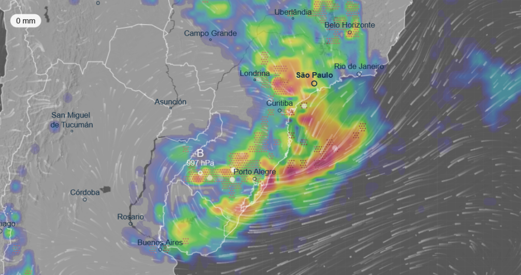 Em entrevista à Rádio Maristela, Marcelo explicou que o sistema começou a ganhar força nas primeiras horas do dia, especialmente por causa da formação do núcleo da baixa pressão no centro do Estado. “Estamos vivendo o primeiro estágio da influência direta do ciclone. O vento começa a soprar do mar para o continente, sobe o paredão da serra e provoca chuvas intensas, o que já é observado agora”, afirmou.
