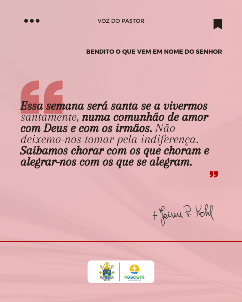 Essa semana será santa se a vivermos santamente, numa comunhão de amor com Deus e com os irmãos. Não deixemo-nos tomar pela indiferença. Saibamos chorar com os que choram e alegrar-nos com os que se alegram.