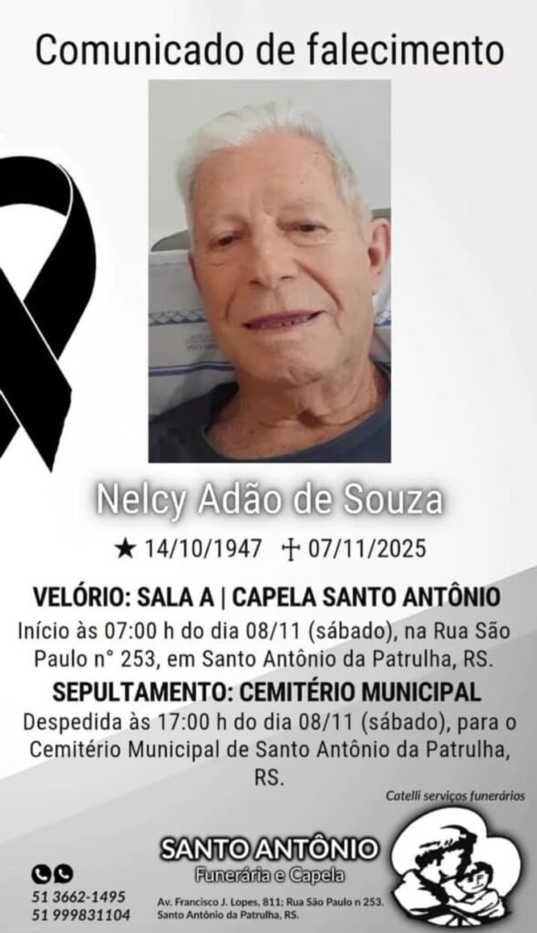 O corpo está sendo velado na Capela Santo Antônio (Catelli) e o sepultamento ocorre neste sábado (08), às 17h, no Cemitério Municipal de Santo Antônio da Patrulha.