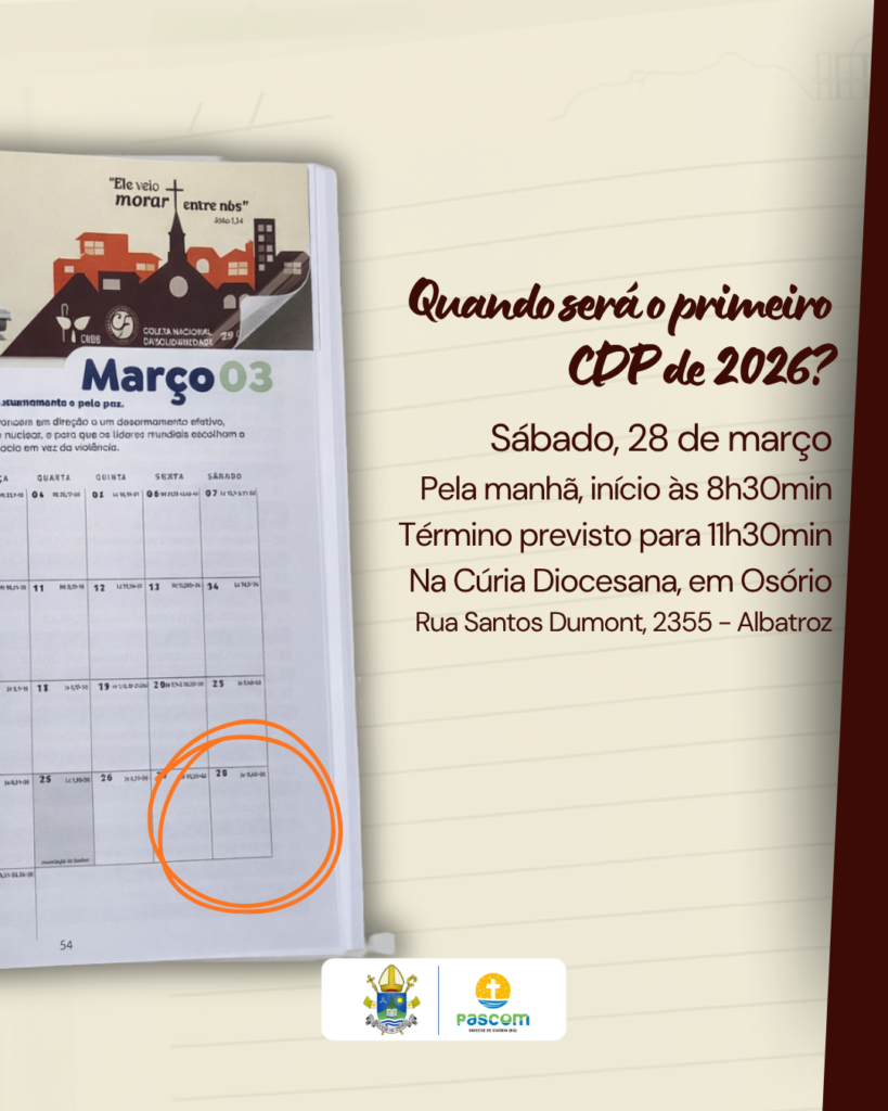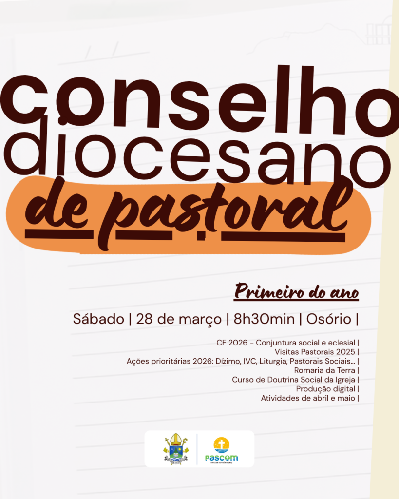A Diocese de Osório promove, no dia 28 de março, sábado, o primeiro encontro do ano do Conselho Diocesano de Pastoral (CDP), reunindo coordenadores diocesanos de pastorais, movimentos, associações e representantes dos conselhos paroquiais para avaliação, planejamento e alinhamento das ações evangelizadoras. A reunião ocorrerá pela manhã, com início às 8h30min e término previsto para as 11h30min, na Cúria Diocesana, localizada na Rua Santos Dumont, 2355, bairro Albatroz, em Osório.