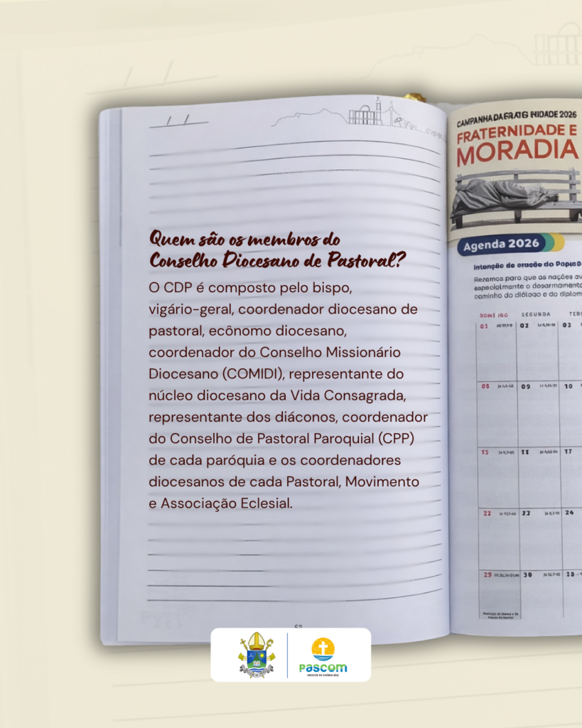 Conforme a programação, estarão em pauta temas como a conjuntura social e eclesial à luz da Campanha da Fraternidade 2026, as Visitas Pastorais, as ações prioritárias para 2026, incluindo Dízimo, IVC, Liturgia e Pastorais Sociais, além da Romaria da Terra, o Curso de Doutrina Social da Igreja, iniciativas de produção digital e o planejamento das atividades previstas para os meses de abril e maio.