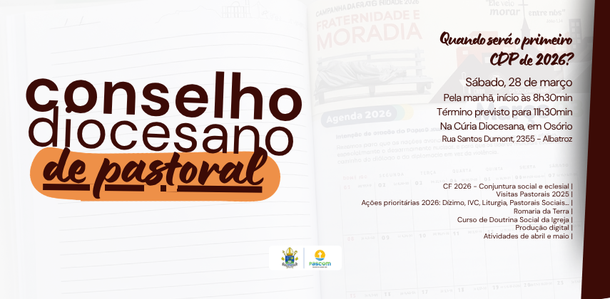 A Diocese de Osório promove, no dia 28 de março, sábado, o primeiro encontro do ano do Conselho Diocesano de Pastoral (CDP), reunindo coordenadores diocesanos de pastorais, movimentos, associações e representantes dos conselhos paroquiais para avaliação, planejamento e alinhamento das ações evangelizadoras. A reunião ocorrerá pela manhã, com início às 8h30min e término previsto para as 11h30min, na Cúria Diocesana, localizada na Rua Santos Dumont, 2355, bairro Albatroz, em Osório.
