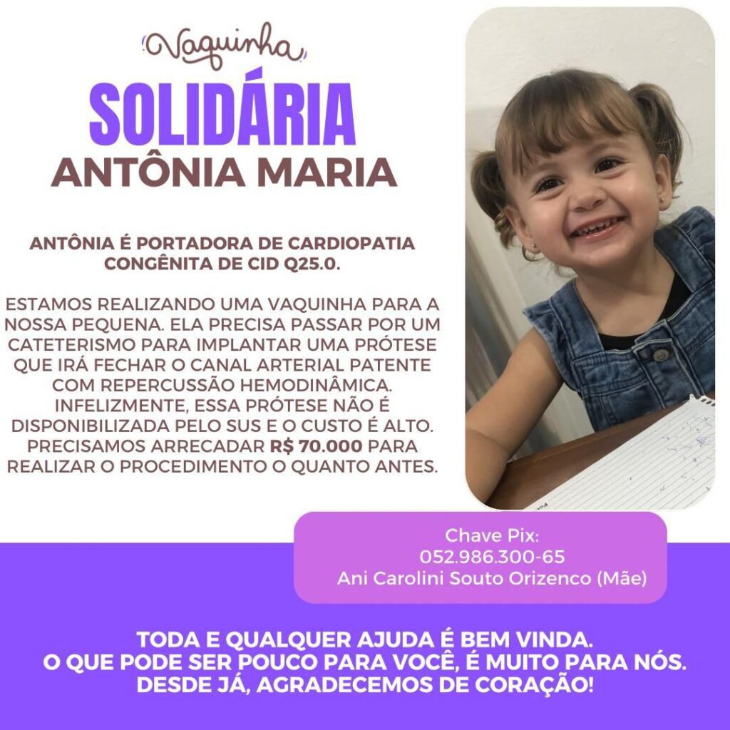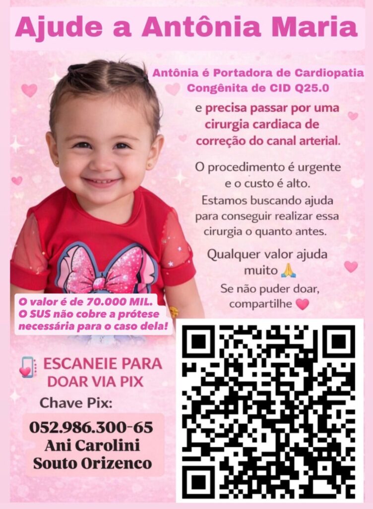 Filha de Ani Carolini Souto Orizenco e neta de Paula Souto, Antônia cresceu como qualquer criança saudável, até que, ainda nos primeiros dias de vida, um sopro cardíaco acendeu um alerta. Inicialmente considerado inocente, o quadro evoluiu silenciosamente. Aos oito meses, o diagnóstico indicou “canal arterial patente (PCA)”. A esperança era de fechamento natural. Mas o tempo não foi aliado.
