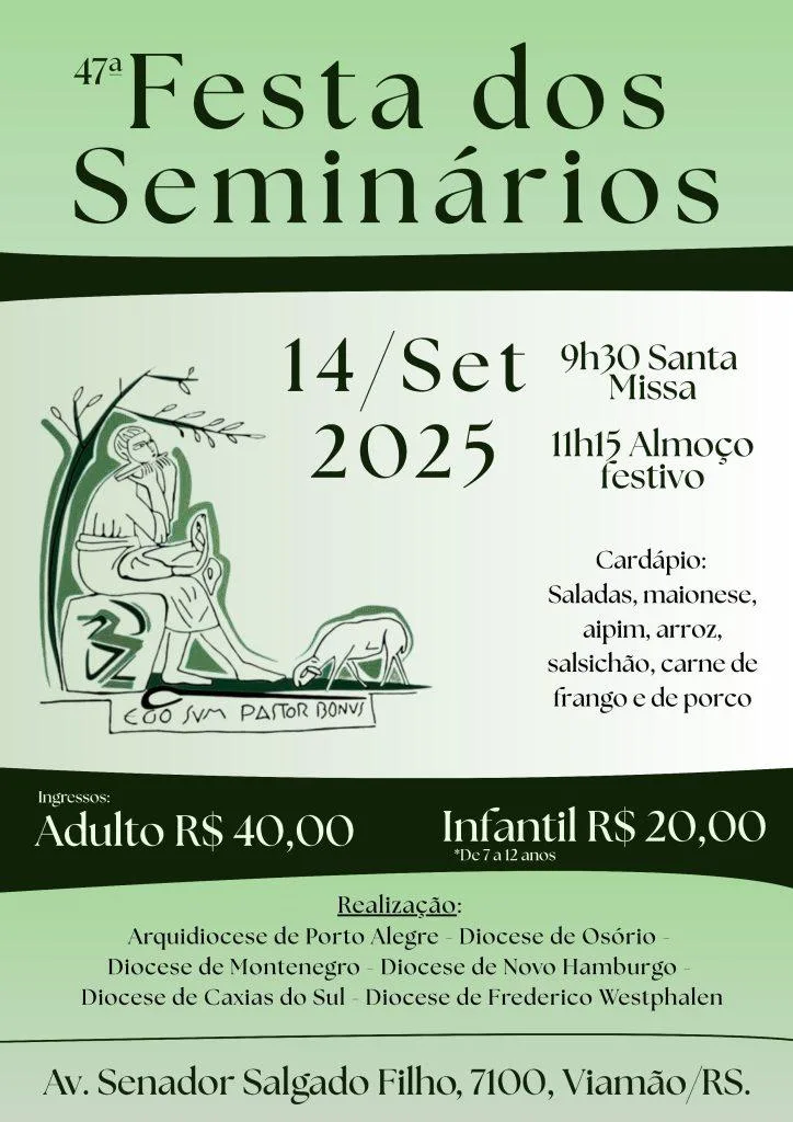 A Diocese de Osório convida fiéis, amigos e comunidades paroquiais para a tradicional Festa dos Seminários, que neste ano chega à sua 47ª edição e terá sua organização conduzida pelos seminaristas e formador da própria Diocese de Osório. O evento será realizado no dia 14 de setembro, no Centro de Formação Presbiteral, na Av. Senador Salgado Filho, 7100, bairro São Lucas, Viamão/RS, reunindo padres, seminaristas, familiares e apoiadores das vocações sacerdotais.