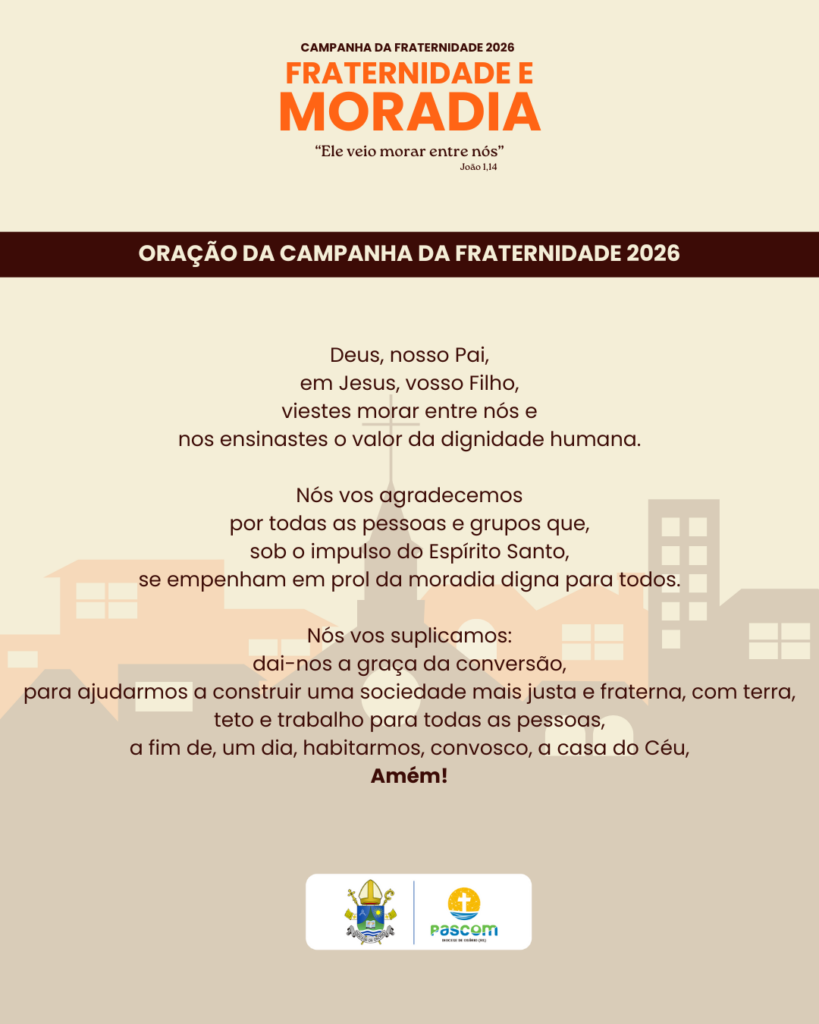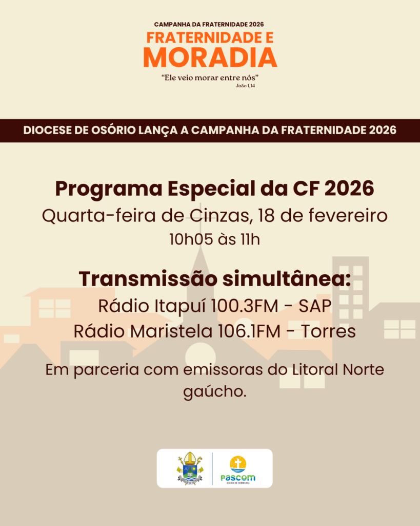 A Diocese de Osório, que reúne 23 paróquias no Litoral Norte gaúcho, realiza na Quarta-feira de Cinzas, 18 de fevereiro, o lançamento da Campanha da Fraternidade 2026 (CF 2026), que traz como tema “Fraternidade e Moradia” e o lema “Ele veio morar entre nós” (Jo 1,14).