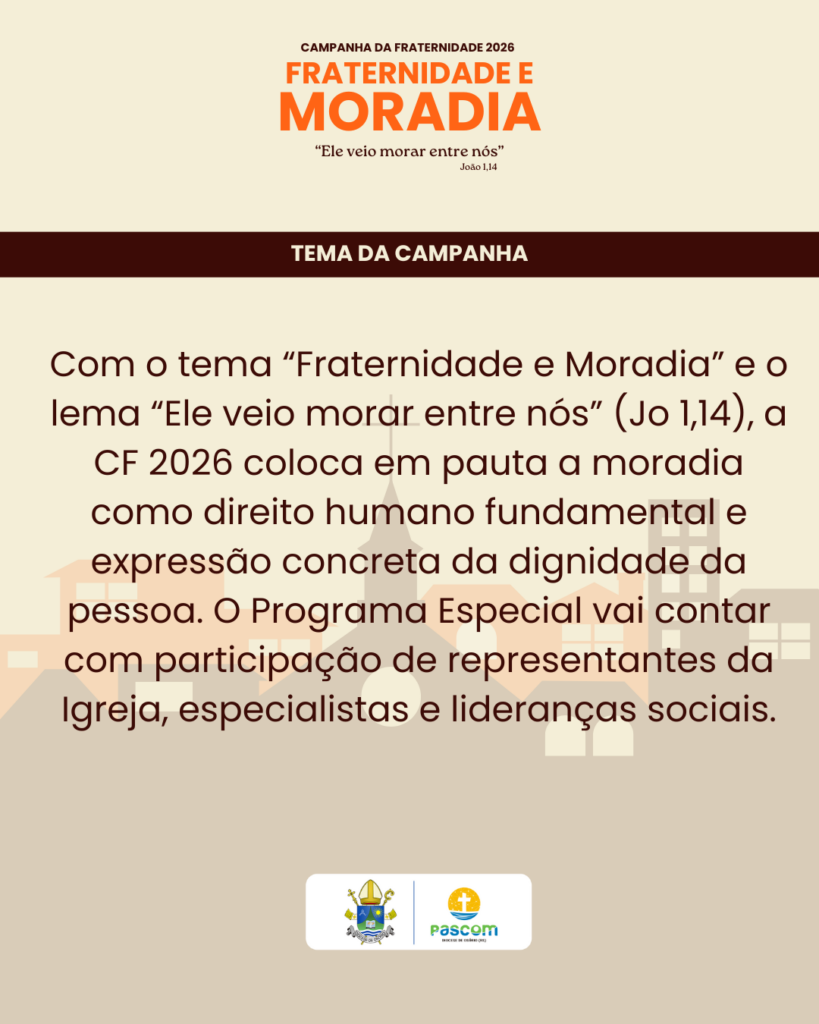 - 13/03, às 10h20 – Caminhos para a promoção da moradia digna, o papel da Igreja e as ações concretas propostas pela CF 2026.