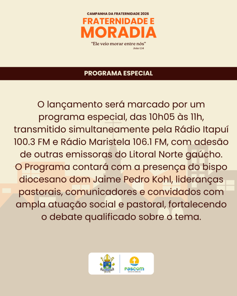 O lançamento ocorrerá por meio de um programa especial gerado pela Rádio Itapuí 100.3 FM, de Santo Antônio da Patrulha, e transmitido pela Rádio Maristela 106.1 FM, de Torres, ambas vinculadas à Diocese de Osório. A programação vai ao ar das 10h05 às 11h e contará com a transmissão de emissoras do Litoral Norte gaúcho.