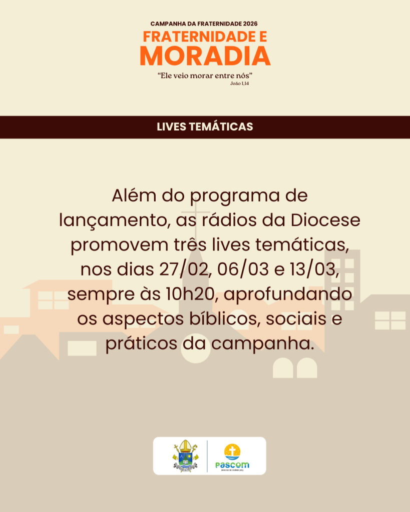 Além do programa especial transmitido pelas emissoras de rádio da região, as duas rádios da Diocese de Osório, Maristela e Itapuí, promoverão três lives temáticas, com duração aproximada de 20 minutos cada, voltadas ao aprofundamento do tema da Campanha da Fraternidade 2026. Os encontros terão formato de entrevistas e reflexão pastoral, abordando aspectos bíblicos, sociais e práticos da campanha.