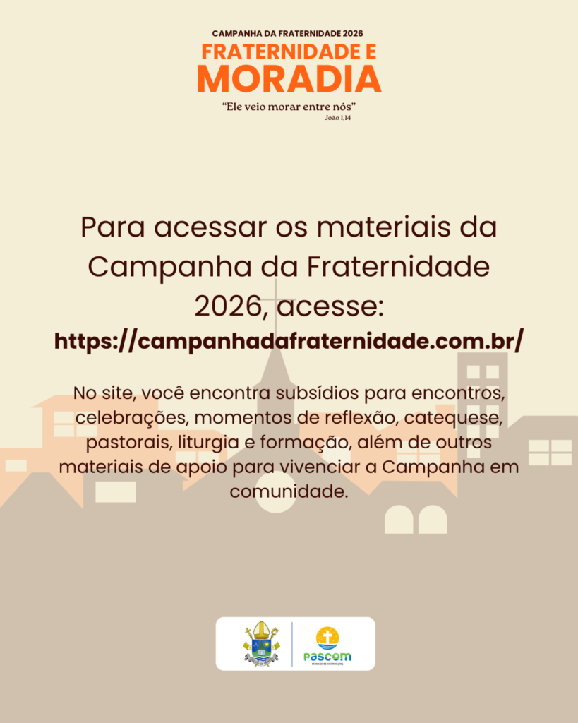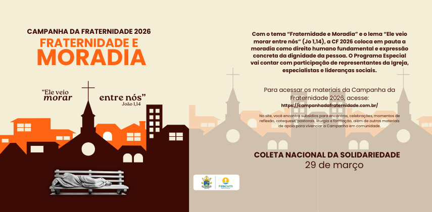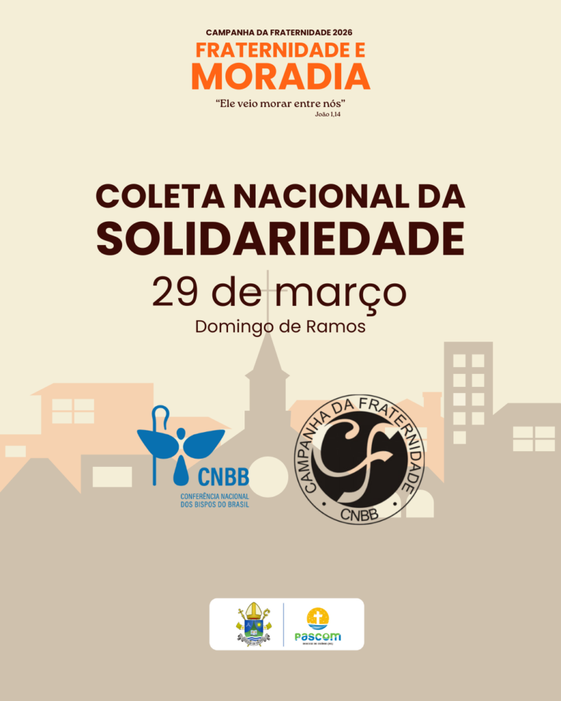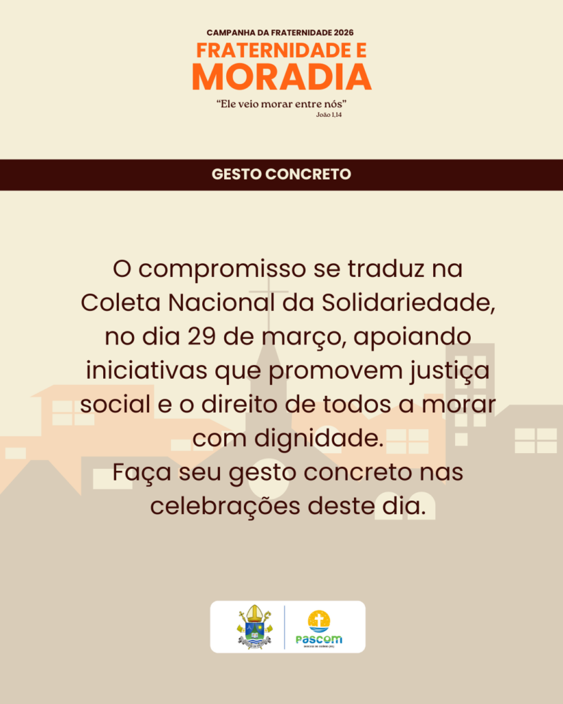 Como gesto concreto da Campanha da Fraternidade, a Igreja no Brasil realizará a Coleta Nacional da Solidariedade no dia 29 de março. Em 2026, ao refletir sobre a moradia, a Igreja convida a sociedade a construir relações mais justas e solidárias, garantindo que ninguém seja privado do direito de morar com dignidade.