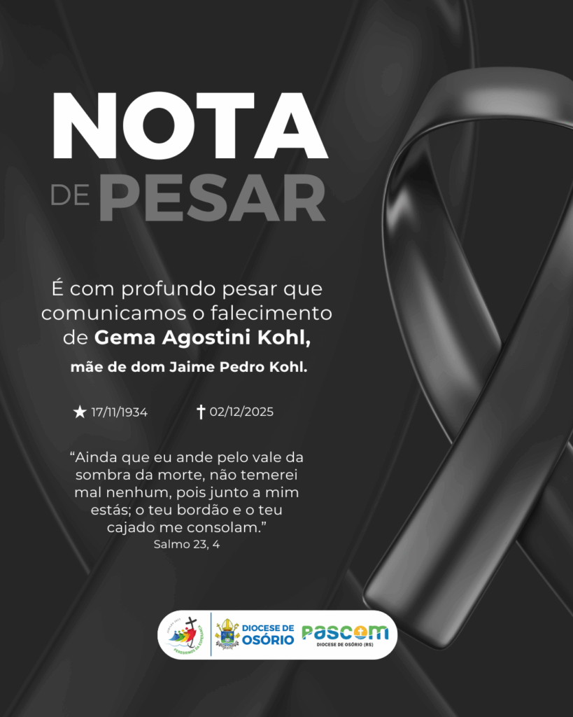 A Diocese de Osório comunica, com profundo pesar, o falecimento de Gema Agostini Kohl, mãe do bispo diocesano, dom Jaime Pedro Kohl, ocorrido na manhã desta terça-feira, 2 de dezembro de 2025. Dona Gema, nascida em 17 de novembro de 1934, tinha 91 anos e vinha enfrentando um período de fragilidade em razão do avanço do Alzheimer.