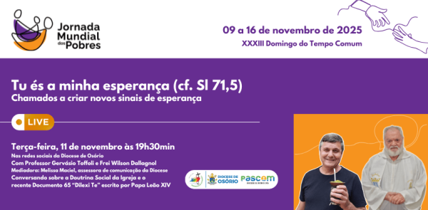 Como parte da programação, a Diocese de Osório, por meio da Executiva das Pastorais Sociais, realizará uma live especial no dia 11 de novembro, terça-feira, às 19h30min, transmitida pela página da Diocese no Facebook. O encontro contará com a participação do Professor Gervásio Toffoli e do Frei Wilson Dallagnol, que irão dialogar sobre a Doutrina Social da Igreja e o recente Documento 65 “Dilexi Te”, escrito por Papa Leão XIV, que aprofunda o compromisso da Igreja com a justiça social e a dignidade humana.