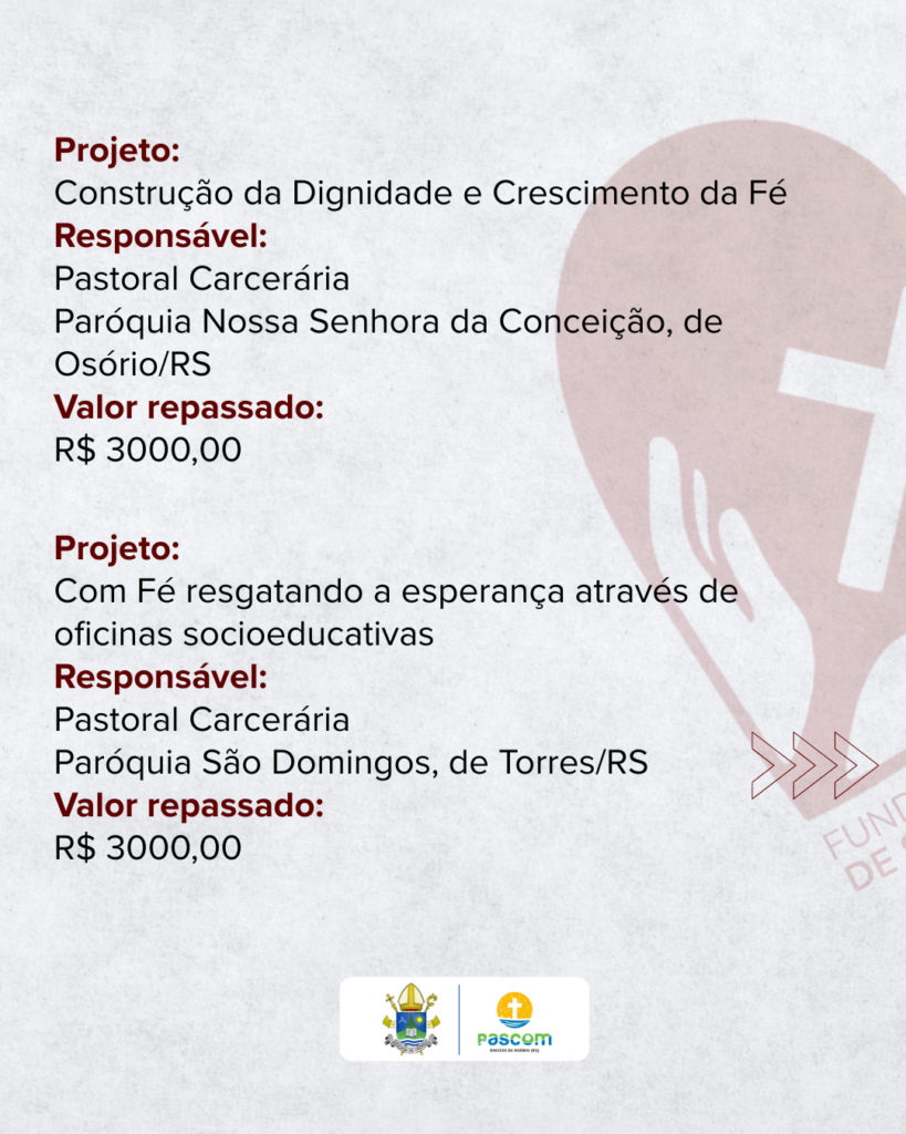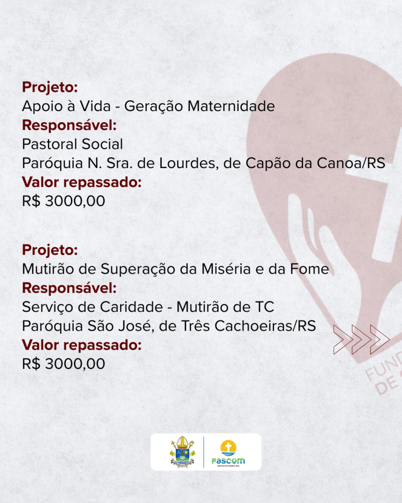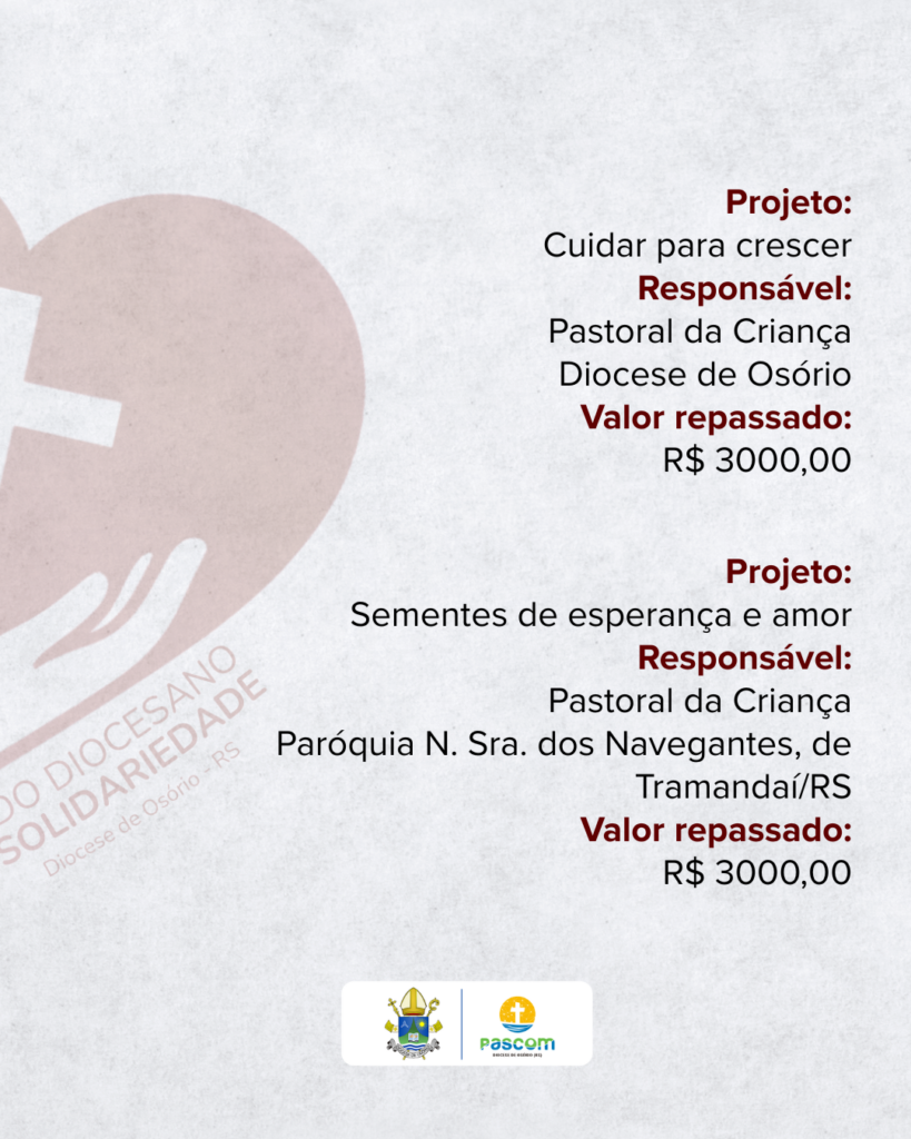 “Cuidar para Crescer”, da Pastoral da Criança Diocesana (R$ 3.000,00); “Sementes de Esperança e Amor”, da Pastoral da Criança de Tramandaí (R$ 3.000,00);