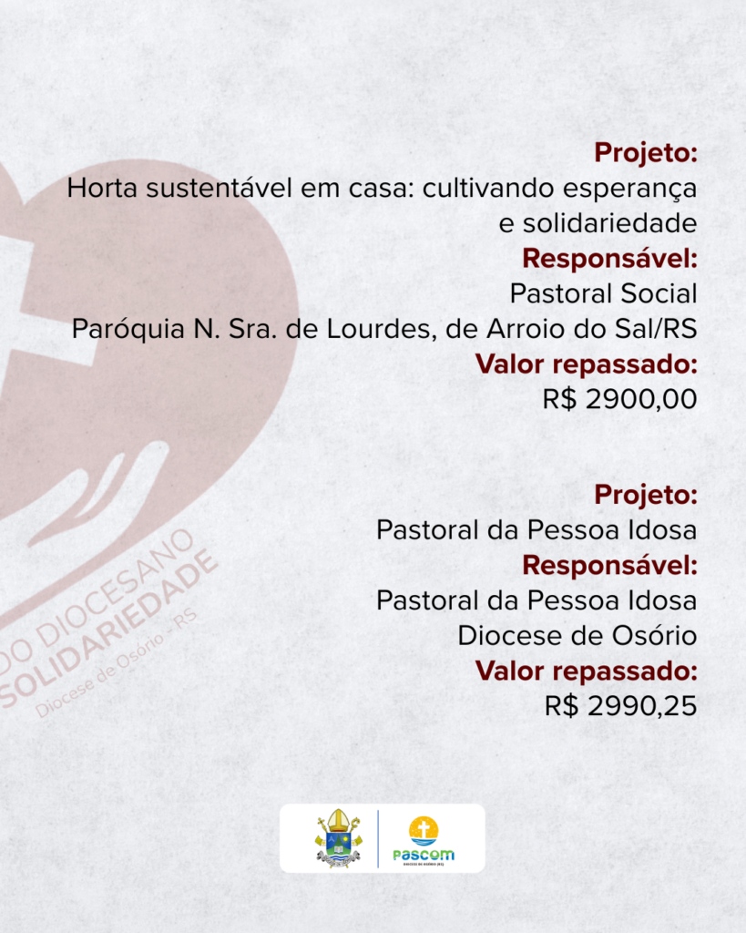 “Projeto da Pastoral da Pessoa Idosa Diocesana (R$ 2.990,25).