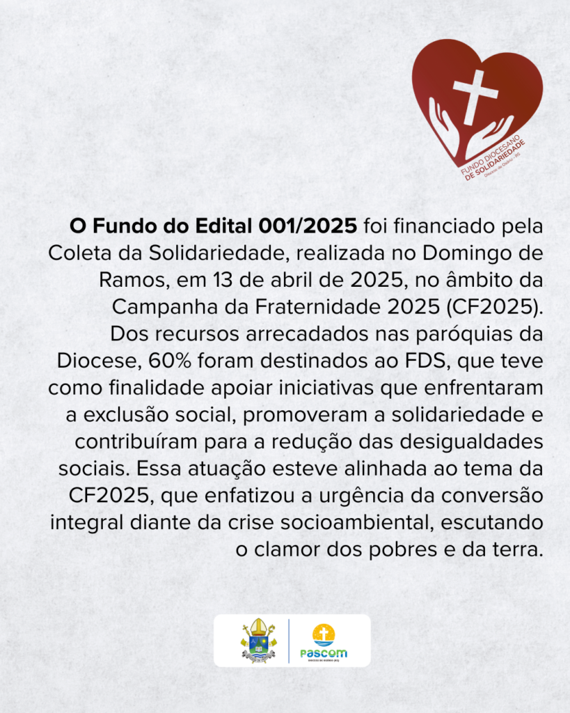 A Diocese já sinaliza que, na próxima semana, será lançado o Edital 2026 do Fundo Diocesano de Solidariedade, abrindo nova oportunidade para que paróquias, pastorais e organismos eclesiais apresentem projetos e ampliem o alcance das ações sociais em favor dos mais vulneráveis.