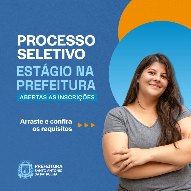 A prefeitura de Santo Antônio da Patrulha está com inscrições abertas para selecionar candidatos para o quadro de estagiários do município. Para participar, é preciso ter, no mínimo, 16 anos completos, comprovação de matrícula no curso escolhido e não ter sido estagiário da Prefeitura anteriormente por mais de 18 meses.