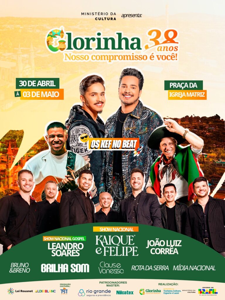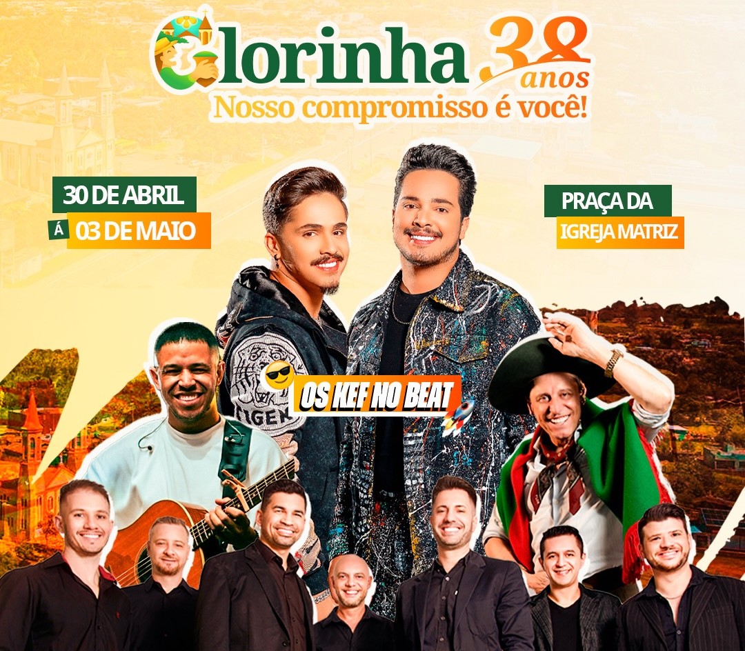 O município de Glorinha realiza, entre os dias 30 de abril e 3 de maio, a programação especial em comemoração aos seus 38 anos. As atividades acontecem na Praça da Igreja Matriz e incluem atrações musicais e momentos de celebração abertos à comunidade.