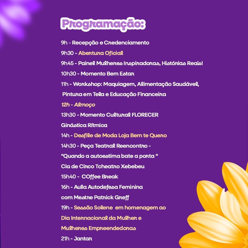 Além das atividades culturais e formativas, o encontro também terá a Feira de Mulheres Empreendedoras. A proposta é promover um dia de celebração, aprendizado e troca de experiências entre as participantes.
