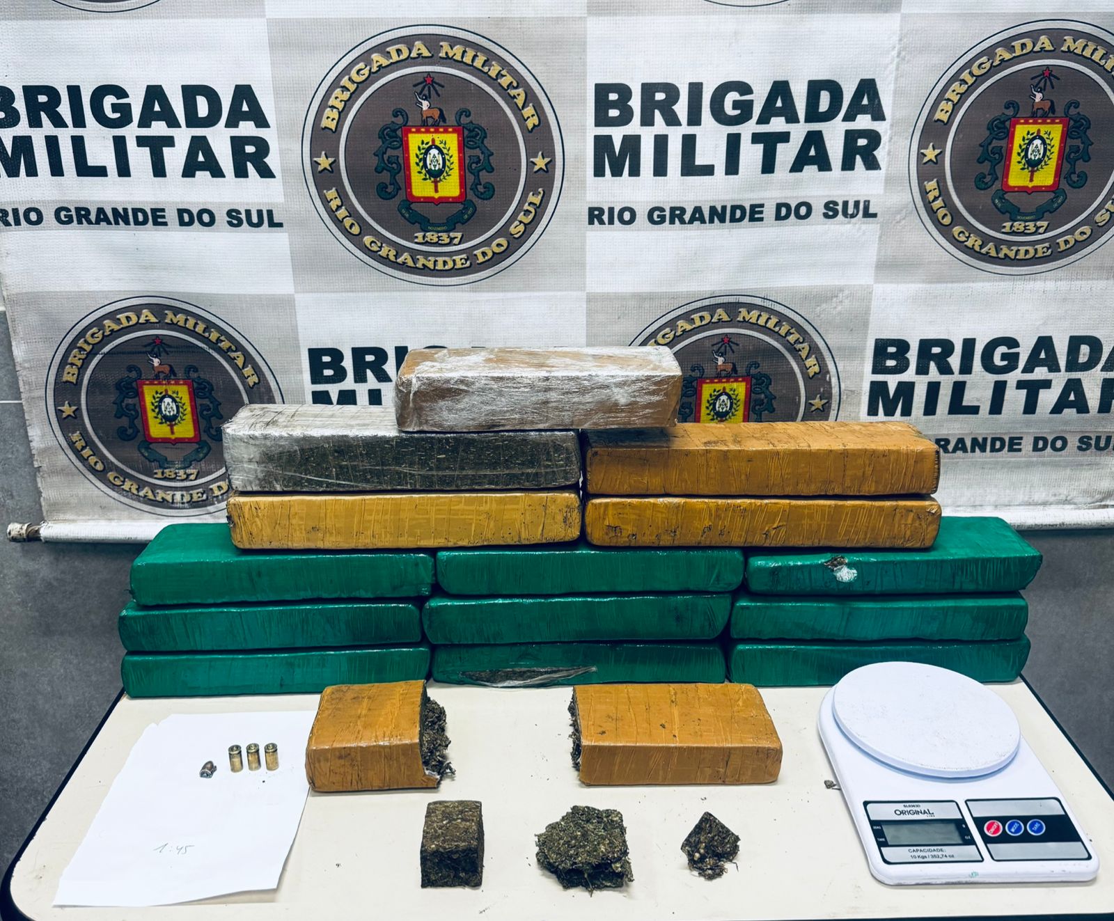 Já em Capão da Canoa, no bairro Parque Antártica, a Força Tática do 2º BPAT apreendeu quase 12 quilos de maconha após receber informações sobre a chegada de uma grande carga da droga. Durante a abordagem, o suspeito abandonou um saco de ração e fugiu, disparando contra os policiais antes de escapar por becos e muros da região. Dentro do saco foram encontrados 14 tabletes de maconha, cinco porções menores e uma balança de precisão. No local dos disparos, três estojos de calibre 9mm foram recolhidos.