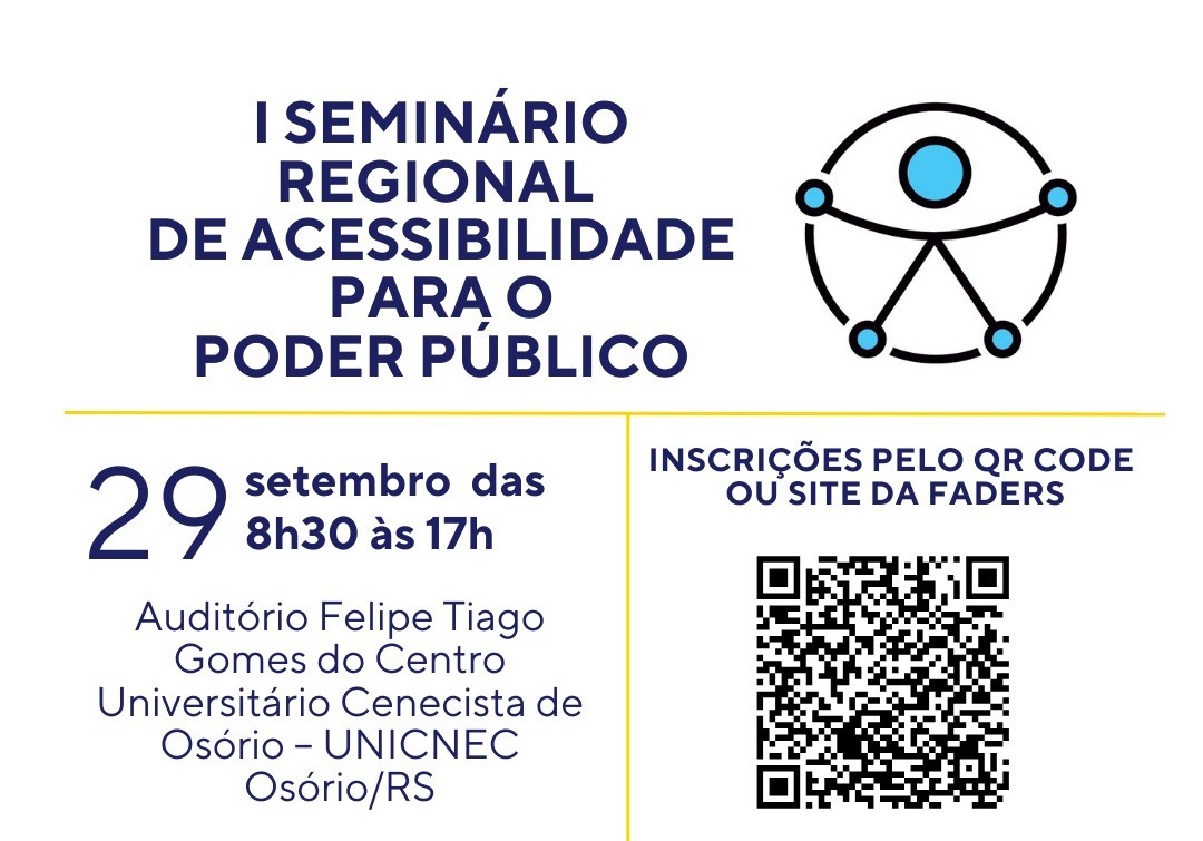 Na próxima segunda-feira (29/09), o município de Osório será sede do I Seminário Regional de Acessibilidade para o Poder Público, um evento inédito que reunirá gestores, servidores públicos, acadêmicos e profissionais para debater a implementação de políticas de acessibilidade e o fortalecimento da inclusão no Litoral Norte e Médio do Estado.