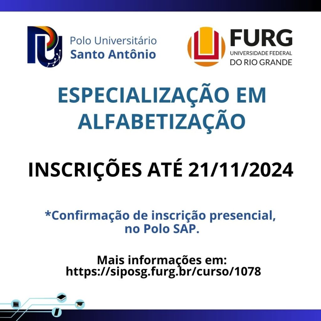 O Polo Universitário Santo Antônio está com inscrições abertas, até o dia 21 de novembro, para o curso de Especialização em Alfabetização.