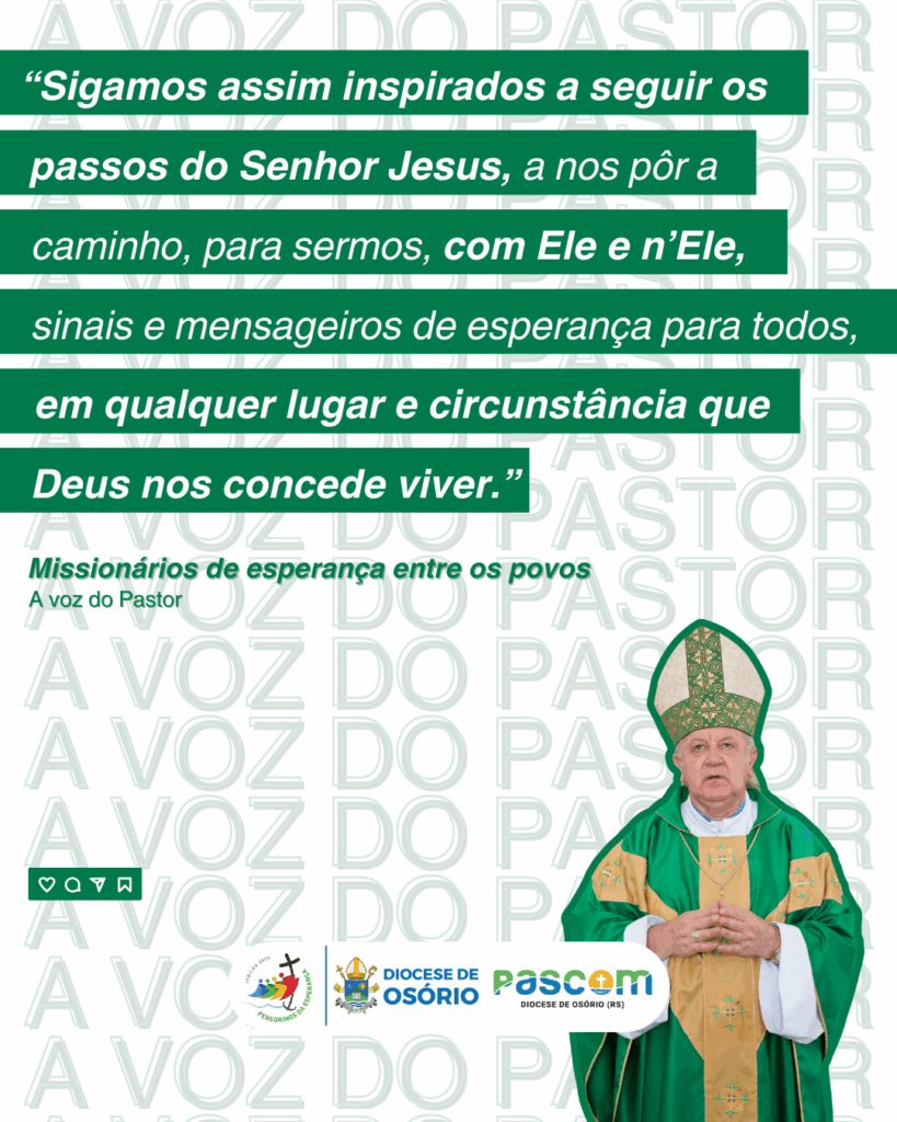 Sigamos, assim, inspirados a trilhar os passos do Senhor Jesus, a nos pôr a caminho para sermos, com Ele e n’Ele, sinais e mensageiros de esperança para todos, em qualquer lugar e circunstância que Deus nos conceda viver. Que cada batizado, discípulo-missionário de Cristo, faça brilhar a Sua esperança em todos os cantos da terra!”