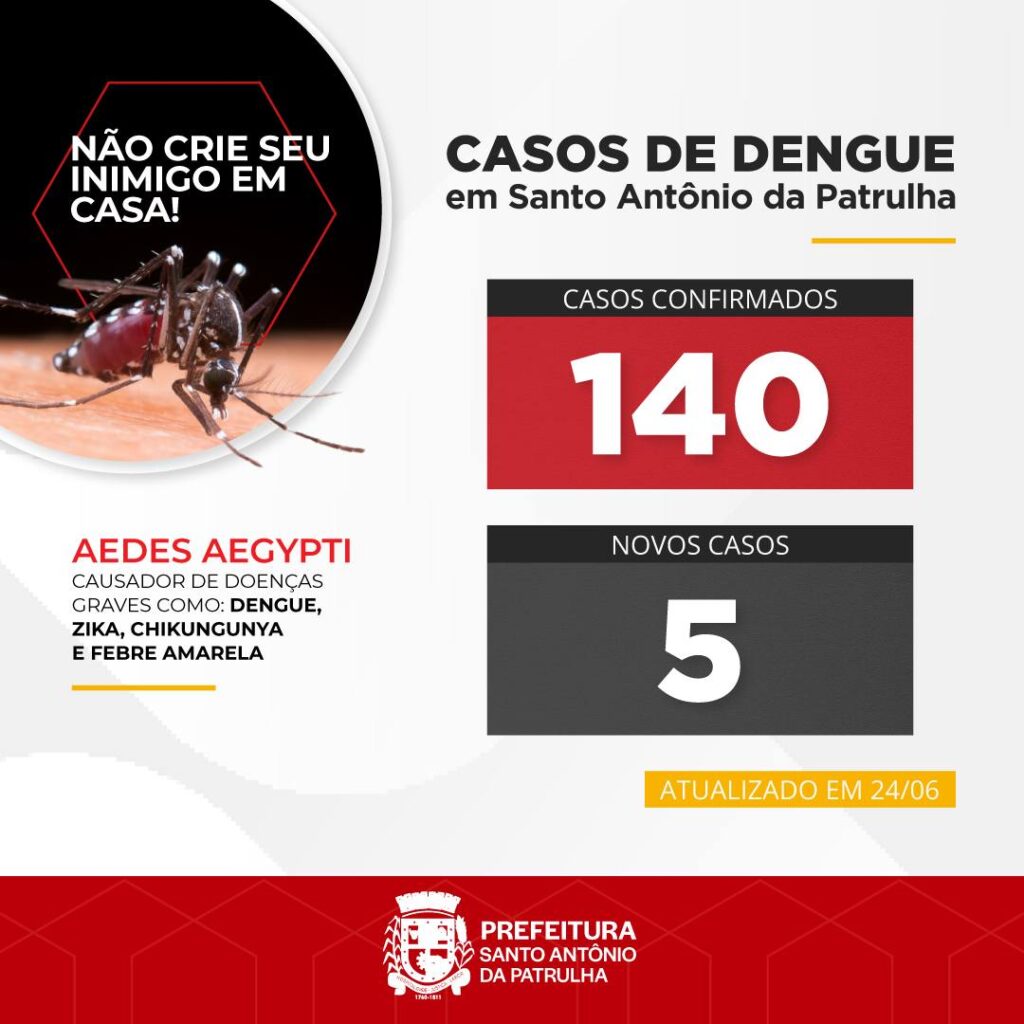 O município de Santo Antônio da Patrulha registra, até o momento, 140 casos de dengue, com o registro de 5 novos casos na última semana. Não há registros de óbitos pela doença.