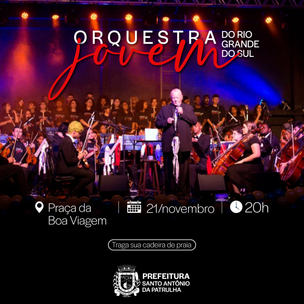 No próximo dia 21 de novembro, o grupo Orquestra Jovem do RS se apresenta em Santo Antônio da Patrulha, na Praça Nossa Senhora da Boa Viagem, a partir das 20h.