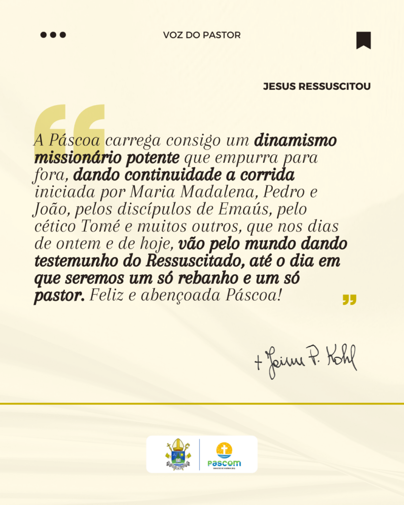 Para o bispo, a Páscoa é a festa da vida que renova, desperta e envia os cristãos à missão, convidando cada pessoa a deixar-se envolver pelo mistério do amor de Deus e a viver com esperança a certeza fundamental da fé cristã: Jesus está vivo e continua caminhando com seu povo.