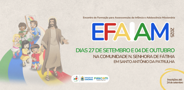 A Diocese de Osório, por meio do Conselho Missionário Diocesano (COMIDI), promoverá nos dias 27 de setembro e 4 de outubro de 2025, sábados, o Encontro de Formação para novos Assessores da Infância e Adolescência Missionária (EFAIAM), destinado a jovens, a partir dos 16 anos, e adultos que desejam se dedicar à missão de acompanhar grupos de crianças e adolescentes em suas comunidades. A formação acontecerá na comunidade Nossa Senhora de Fátima, localizada na Rua Edemar da Silva Braga, nº 305, Bairro Várzea, em Santo Antônio da Patrulha, na Paróquia Santo Antônio. A formação é aberta a participantes de todas as paróquias da Diocese.