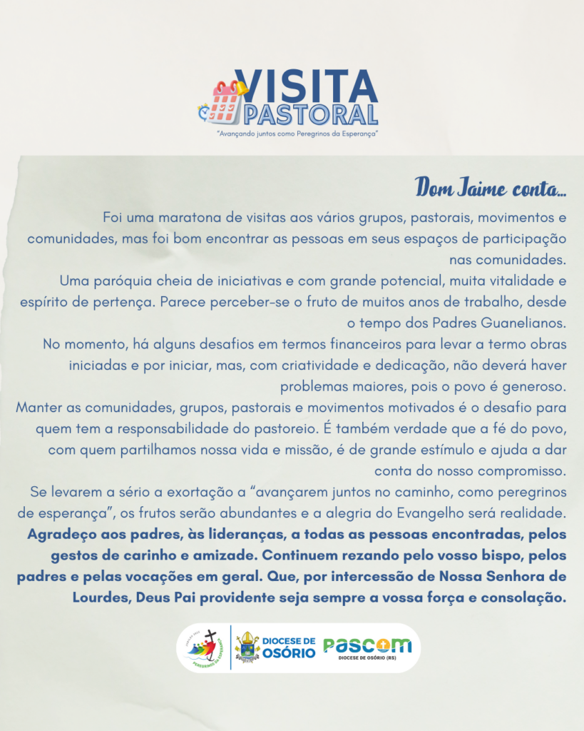 No relatório da visita, o bispo da Diocese de Osório, dom Jaime Pedro Kohl, destacou o forte senso de pertença das comunidades, a participação ativa dos fiéis e o compromisso com a Iniciação à Vida Cristã, a liturgia e as diversas expressões de caridade, mesmo diante de desafios financeiros e estruturais. A paróquia demonstra grande potencial evangelizador, fruto de uma caminhada sólida ao longo dos anos, sustentada pela fé do povo e pela dedicação das lideranças. A exortação a “avançar juntos como peregrinos de esperança” permanece como horizonte pastoral, fortalecendo a unidade, a perseverança e a alegria do Evangelho na vida da comunidade.